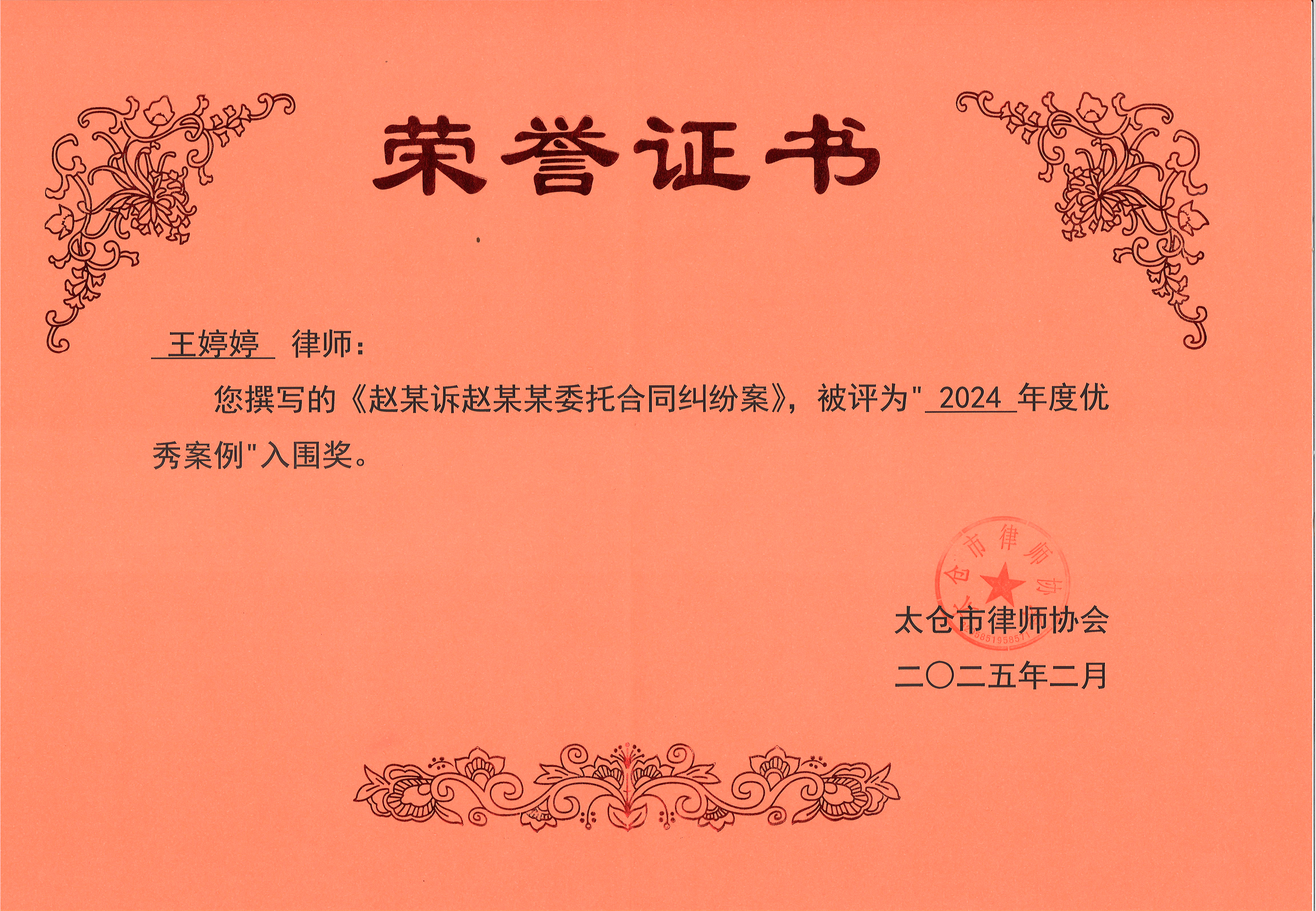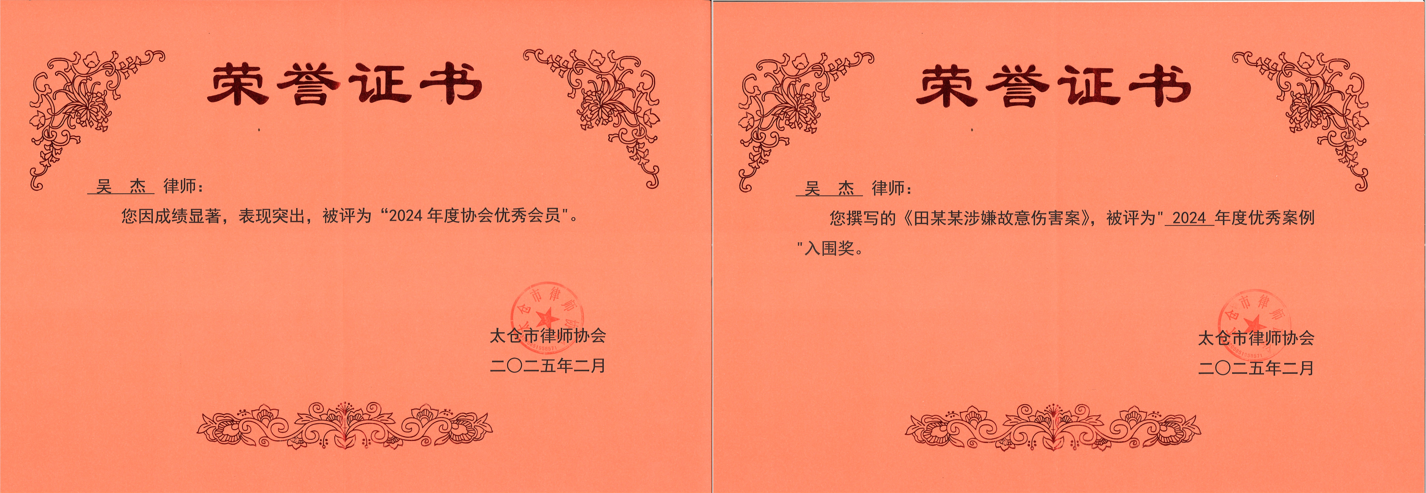 吴杰律师获评“2024年度协会优秀会员”荣誉称号,同时其撰写的《田某某涉嫌故意伤害案》被评为“2024年度优秀案例”入围奖。