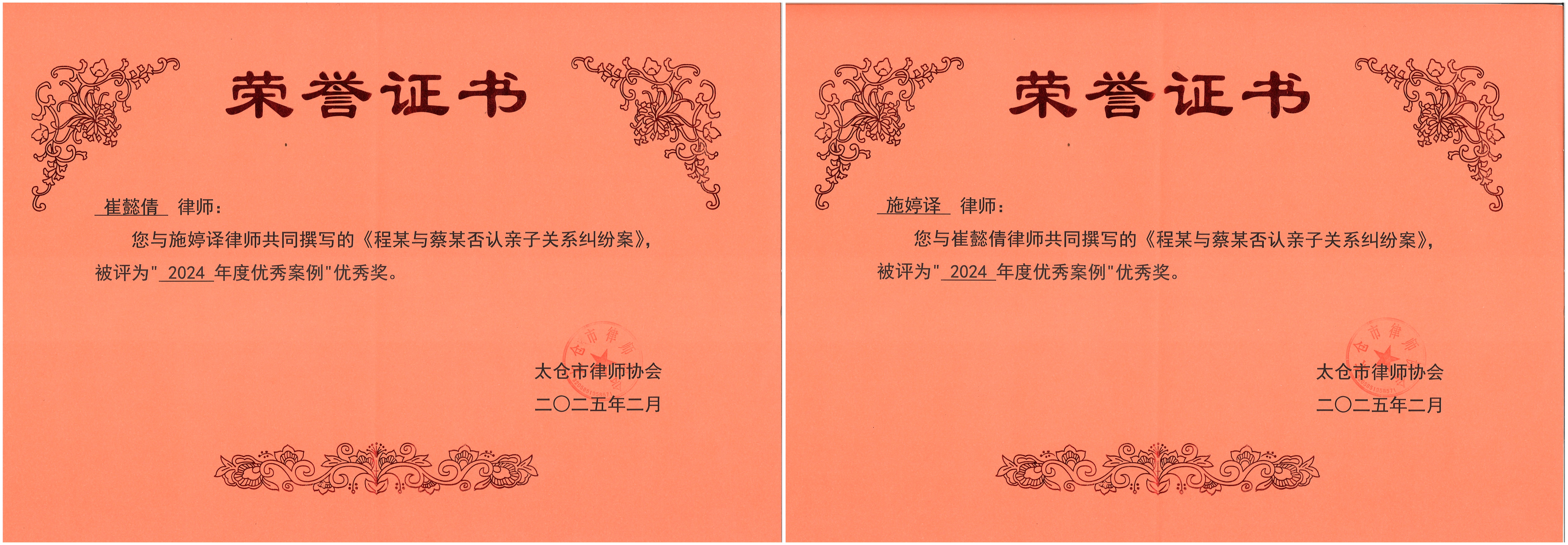 崔懿倩、施婷译律师撰写的《程某与蔡某否认亲子关系纠纷》,被评为“2024年度优秀案例”优秀奖